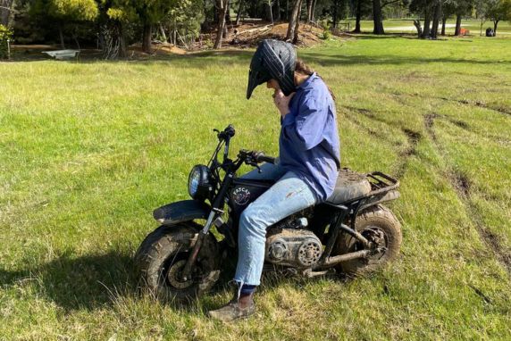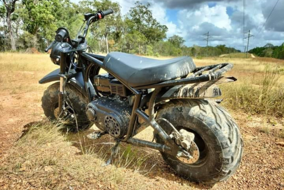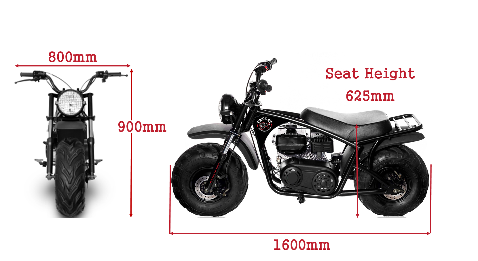Bike dimensions - 1600mm long, 800mm wide, 900mm high. The seat height 625mm (off the ground) and the bike has a weight of 75kg with easy pull start engine.